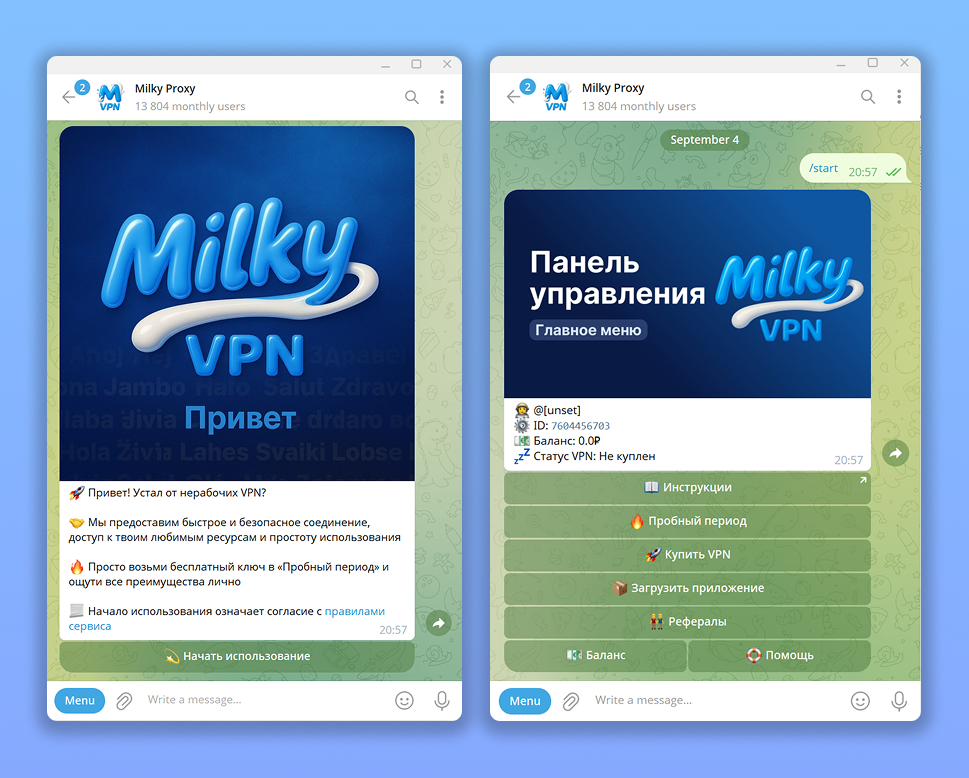 Запустив Telegram-бот впервые, вы увидите приветствие, а затем перейдёте в главное меню, где собраны все инструменты для работы с VPN.